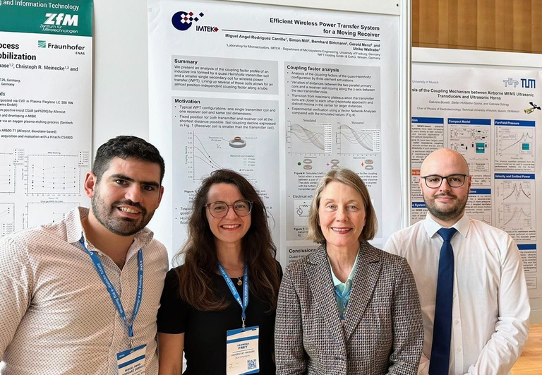 Die Professur für Mikroaktorik war beim diesjährigen MST Kongress in Dresden mit mehreren Beiträgen vertreten. Yasmina Frey hielt einen Vortrag über minimal-invasive Küvetten zur Messung von flüchtigen organischen Verbindungen an Blättern, Pascal Weber berichtete von seiner Forschung über magnetische Aktuierung ohne Ausleger. Beide Vorträge stießen beim Fachpublikum auf reges Interesse, ebenso das Poster von Miguel Rodriguez mit dem Titel "Efficient Wireless Power Transfer System for A Moving Receiver“. Zusätzlich zu den fachlichen Beiträgen präsentierte sich die Professur für Mikroaktorik am Stand des IMTEKs mit zahlreichen Exponaten aus der aktuellen Forschung der Professur.