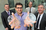 DiscoGnosis Coordinator Konstantinos Mitsakakis (award of the best innovation presentation) showing the LabDisk prototype with event co-organisers (from left to right) from Tyndall (Eric Moore, left) and the EC (Andreas Lymberis, Willy Van Puymbroeck).